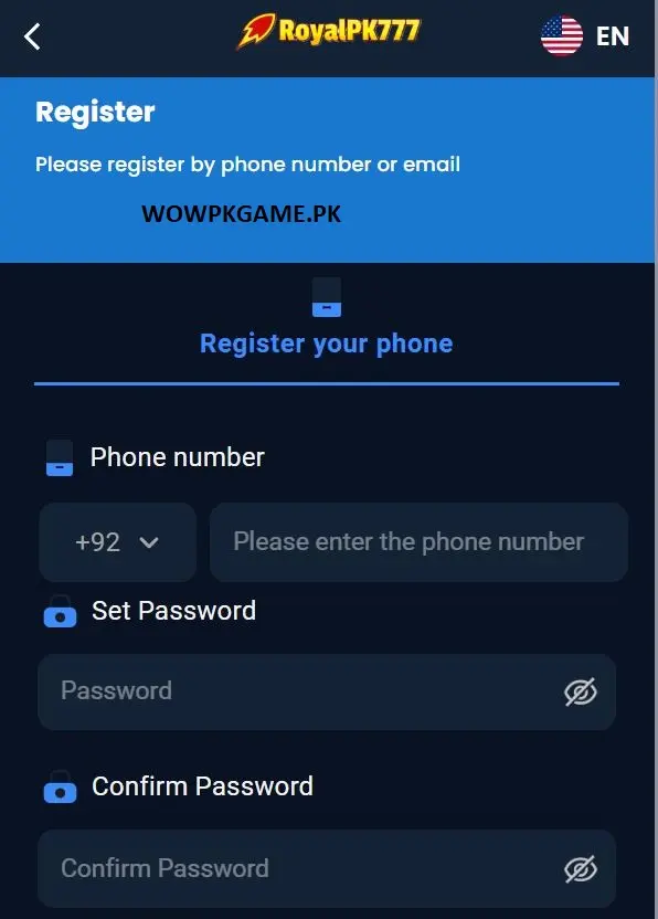 To start using the RoyalPk777, you first create an account by downloading the app and opening it. On the home screen, tap “Register” or “Sign Up” and enter your active mobile number. You will receive a one-time password (OTP) on your phone — enter it to verify your number. Next, choose a strong password to protect your account and tap Submit to finish registration. Once registered, go back to the Login page, enter your mobile number and password, and tap Login to access your profile quickly. This simple process ensures secure access to your RoyalPk777 Login account.